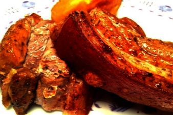 Krompir olupimo, operemo in obrišemo s suho krpo ter ga damo zraven reber (rebra obrnemo s kožo navdol) v keramični pekač, v katerem se bo vse skupaj peklo. Dodamo še olupljeno in prerezano čebulo. Vse skupaj premešamo, da se tudi krompir in čebula zavijeta v marinado od mesa. Po potrebi še solimo in previdno, da ne speremo marinade z mesa oz. krompirja, prilijemo toliko vode, da je bo nekje v višini enega centimetra.